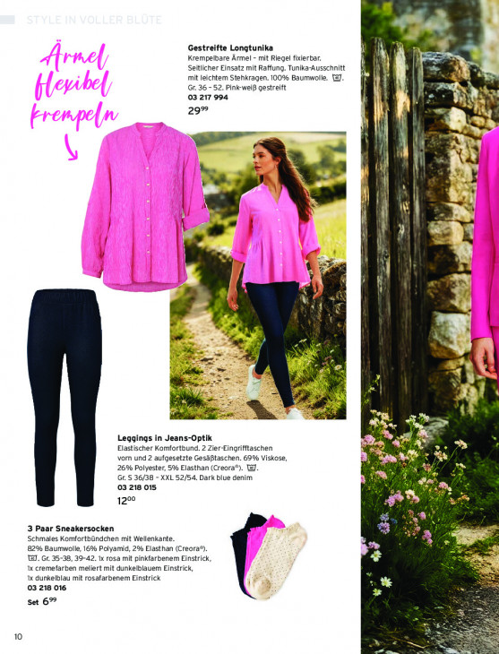 Bitte beachten Sie, dass dieser Text automatisch generiert wird und möglicherweise Fehler enthältGestreifte Longtunika 3 Krempelbare Ärmel - mit Riegel fixierbar. 1 Seitlicher Einsatz mit Raffung. Tunika-Ausschnitt | mit leichtem Stehkragen. 100% Baumwolle. WJ. Hi Gr. 36 - 52. Pink wei gestreift HS 03 217 994 N N 29% N | ie ä = il \ Dia. Ve PB u Wi | “| il / N mj D FN € B Sy = % > ne 1, U Frs er Leggings in Jeans-Optik Ke #4) s. > Elastischer Komfortbund. 2 Zier-Eingrifftaschen + vom und 2 aufgesetzte GesäBtaschen. 69% Viskose, 26% Polyester, 5% Elasthan (Creora*). T2]. 7 > x ai ; 2 Gr. S 36/38 - XXL 52/54. Dark blue denim der 03 218 015 ar 200 Rd 3 Paar Sneakersocken Schmales Komfortbündchen mit Wellenkante. En 82% Baumwolle, 16% Polyamid, 2% Elasthan (Creora®). tal. Gr. 35-38, 39-42. 1x rosa mit pinkfarbenem Einstrick, 1x cremefarben meliert mit dunkelblauem Einstrick, 1x dunkelblau mit rosafarbenem Einstrick 03 218 016 Set 6% = 5 10 2