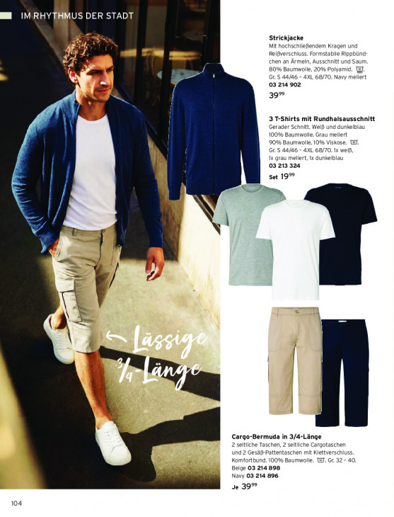 Bitte beachten Sie, dass dieser Text automatisch generiert wird und möglicherweise Fehler enthältIMRHYTHMUS DER STAD er a Strickjacke Mit hochschlieBendem Kragen und 5) Z Reißverschluss. Formstabile Rippbünd- chen an Ärmeln, Ausschnitt und Saum, Fe 80% Baumwolle, 20% Polyamid. @. Gr. S 44/46 - 4XL 68/70. Navy meliert 03 214 902 39% En we 3 T-Shirts mit Rundhalsausschnitt Gerader Schnitt. Weiß und dunkelblau 100% Baumwolle. Grau meliert 90% Baumwolle, 10% Viskose. Ul. Gr. S 44/46 - 4XL 68/70. 1x weiß, Ix grau meliert, Ix dunkelblau = 03 213 324 Ser 19° T Be pP en, A an ue ñ = cp / Ei 5 ra em 4% Cargo-Bermuda in 3/4-Länge 2 seitliche Taschen, 2 seitliche Cargotaschen und 2 Gesäß-Pattentaschen mit Klettverschluss. Komfortbund. 100% Baumwolle. 18T. Gr. 32 - 40. We Beige 03 214 898 i 5; Li ii Navy 03 214 896 Je 39% 104