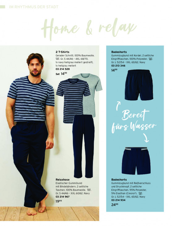 Bitte beachten Sie, dass dieser Text automatisch generiert wird und möglicherweise Fehler enthält2 T-Shirts Badeshorts Gerader Schnitt. 100% Baumwolle. Gummizugbund mit Kordel. 2 seitliche Wal. Gr. S 44/46 - AXL 68/70. Eingrifftaschen. 100% Polyester. LI. 1x navy-hellgrau-meliert gestreift, Gr. L52/54 - XXL 60/62. Navy Ix hellgrau meliert 03 213 346 03 214 528 14% set 14% SN ZN; — Ce — == N = rs = hmm == — SE a 1 Ss == eee ee Relaxhose Badeshorts Elastischer Gummibund Gummizugbund mit Reißverschluss mit Bindebändern. 2 seitliche und Druckknopf. 2 seitliche Taschen. 100% Baumwolle. I]. Eingrifftaschen. 95% Polyester, Gr. S 44/46 - XXL 60/62. Navy 5% Elasthan (Creora®). @J. 03 214 967 Gr. L52/54 - XXL 60/62. Navy 1999 03 214 934 | 2499