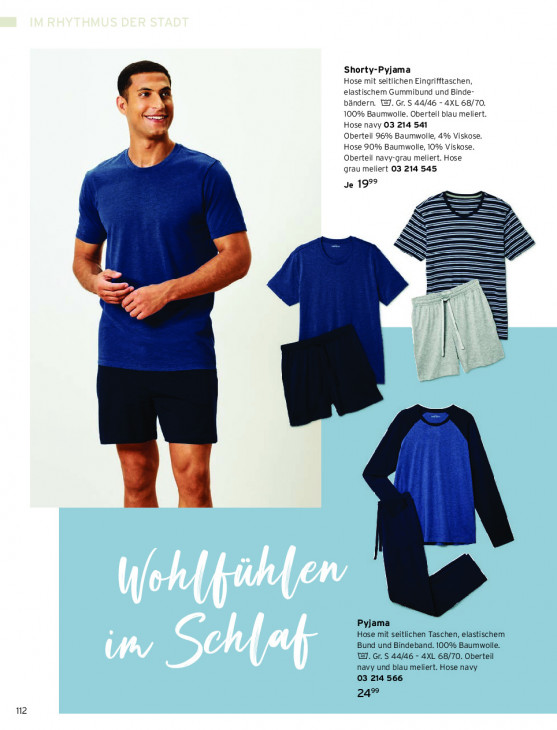 Bitte beachten Sie, dass dieser Text automatisch generiert wird und möglicherweise Fehler enthältShorty-Pyjama Hose mit seitlichen Eingrifftaschen, elastischem Gummibund und Binde- bändern. WJ. Gr. S 44/46 - 4XL 68/70. 100% Baumwolle. Oberteil blau meliert. Hose navy 03 214 541 Oberteil 96% Baumwolle, 4% Viskose. Hose 90% Baumwolle, 10% Viskose. Oberteil navy-grau meliert. Hose grau meliert 03 214 545 Je 199° ÈS = — —> =S Z TL ez — ZE — = | Pyjama Hose mit seitlichen Taschen, elastischem Bund und Bindeband. 100% Baumwolle. T1. Gr. S 44/46 - AXL 68/70. Oberteil navy und blau meliert. Hose navy 03 214 566 24” 112