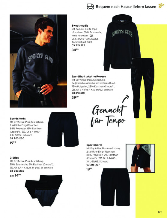 Bitte beachten Sie, dass dieser Text automatisch generiert wird und möglicherweise Fehler enthältEB Bequem nach Hause liefern lassen Sweathoodie Mit Kapuze. Breite Ripp- à bündchen. 60% Baumwolle, 200 I { x js N 40% Polyester. 129. Gr. S 44/46 - XXL 60/62. Anthrazit mit Print 03 215 377 34® m) I“ N a Cl Sporttight »ActivePower« Mit DryActive Plus-Ausrüstung. Reißverschlusstasche am hinteren Bund. | 72% Polyester, 28% Elasthan (Creora®). h EI. Gr. 5 44/46 - XXL 60/62. Schwarz 03 213 601 399° | Genach Sportshorts Mit DryActive Plus-Ausrüstung. 2 seitliche Eingrifftaschen. für Tepe 88% Polyester, 12% Elasthan (Creora®). WI. Gr. S 44/46 - XXL 60/62. Schwarz 03 203 250 1999 Sportshorts Mit Dry Active Plus-Ausrüstung. 2 seitliche Eingrifftaschen. 88% Polyester, 12% Elasthan 3 Slips (Creora®). WI. Gr. S 44/46 - Mit DryActive Plus-Ausrüstung. XXL 60/62. Schwarz 95% Baumwolle, 5% Elasthan (Creora®) 03 215 327 WET. Gr. S/4 - XXL/8. Ix grau, 2x schwarz 199 03 203 236 set 14% 125