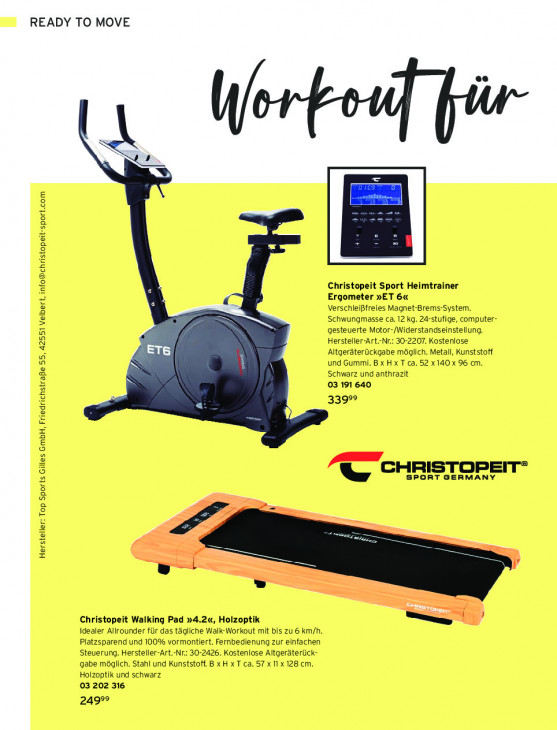 Bitte beachten Sie, dass dieser Text automatisch generiert wird und möglicherweise Fehler enthältREADY TO MOVE Christopeit Sport Heimtrainer Ergometer »ET 6« VerschleiBfreies Magnet-Brems-System. Schwungmasse ca. 12 kg. 24-stufige, computer- gesteuerte Motor-/Widerstandseinstellung. Hersteller-Art.-Nr.: 30-2207. Kostenlose Eu Altgeräterückgabe möglich. Metall, Kunststoff Br und Gummi. BxHxT ca. 52 x140 x 96 cm. Schwarz und anthrazit 03 191 640 >H 5392 « CHRISTOPEIT® 4e SPORT GERMANY op Sports Gilles GmbH, Friedrichstrape 55, 42551 Velbert, [email protected] = a eg, Herstel D Christopeit Walking Pad »4.2«, Holzoptik nl ) Idealer Allrounder für das tägliche Walk-Workout mit bis zu 6 km/h. Platzsparend und 100% vormontiert. Fernbedienung zur einfachen Steuerung. Hersteller-Art. 30-2426. Kostenlose Altgeräterück- ‚gabe möglich. Stahl und Kunststoff. B xH x T ca. 57 x 11 x 128 cm. Holzoptik und schwarz 03 202 316 249°