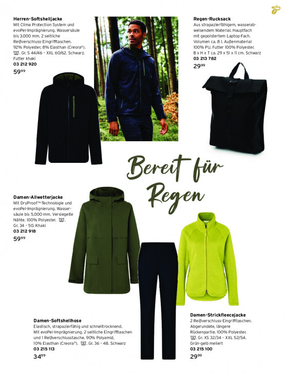 Bitte beachten Sie, dass dieser Text automatisch generiert wird und möglicherweise Fehler enthältHerren-Softshelljacke Regen-Rucksack Mit Clima Protection System und Fa Aus strapazierfähigem, wasserab- + evoPel-mprägnierung. Wassersäule 7 i Yi weisendem Material. Hauptfach bis 3.000 mm. 2 seitliche mit gepolstertem Laptop-Fach. f % Reißverschluss-Eingrifftaschen. F a! Volumen ca. 8 I. Außenmaterial 92% Polyester, 8% Elasthan (Creora®). 100% PU. Futter 100% Polyester. WI. Gr. S 44/46 - XXL 60/62. Schwarz. BXHXTca.29 x 51x 11cm. Schwarz 1 Fi Futter khaki 03 213 782 03 212 920 29° 5999 | le A de SA a À A \ 7 # rue = Bar far Damen-Allwetterjacke Mit DryProof"”-Technologie und evoPel-Imprägnierung. Wasser- säule bis 5.000 mm. Versiegelte Nähte. 100% Polyester. @J. Gr. 34 - 50. Khaki 03 212 918 999 Se ik Damen-Strickfleecejacke Damen-Softshellhose 2 Reißverschluss-Eingrifftaschen. Elastisch, strapazierfähig und schnelltrocknend. Abgerundete, längere Mit evoPel-Imprägnierung. 2 seitliche Eingrifftaschen Rückenpartie. 100% Polyester. und 1 Reißverschlusstasche. 90% Polyamid, W. Gr. XS 32/34 - XXL 52/54. 10% Elasthan (Creora®). WJ. Gr. 36 - 48. Schwarz Grün-gelb meliert 03215113 03 215 100 34 29°