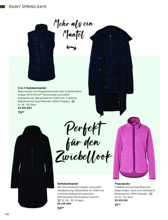 Bitte beachten Sie, dass dieser Text automatisch generiert wird und möglicherweise Fehler enthältEN RAINY SPRING DAYS Mehr- as ein A dl, es 3-in-1-Outdoormantel Regenmantel und Steppweste einzeln oder in Kombination tragbar. Mit DryProof Technologie und evoPel- Imprägnierung. Wassersäule bis 5.000 mm. 2 seitliche ReiBverschluss-Eingrifftaschen. 100% Polyester. 18]. Gr. 36 - 50. Navy 03 210 083 re | Verf a | | Zwiebel lost | Softshellmantel Fleecejacke Mit Clima Protection System und evoPel- 2 Reißverschluss-Eingrifftaschen. Imprägnierung. Wassersäule bis 3.000 mm, ‚Abgerundeter Saum und verlängerte 2 seitliche Reißverschlusstaschen. Rückenpartie. 100% Polyester. W@. 92% Polyester, 8% Elasthan (Creora®). Gr. XS - XL. Rosa W. Gr. 36 - 50. Schwarz 03 215 091 03 215 094 1999 59° 136