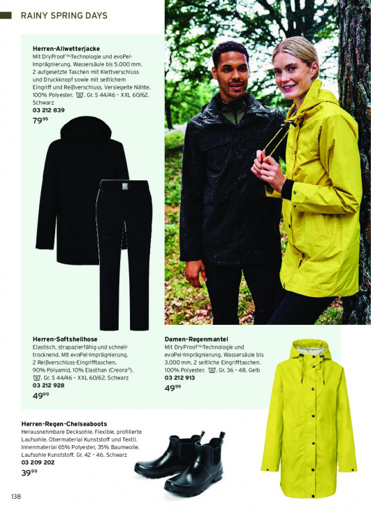 Bitte beachten Sie, dass dieser Text automatisch generiert wird und möglicherweise Fehler enthältbi 4: ah de M) EE RAINY SPRING DAYS ws A: u SS SSI Herren-Allwetterjacke SJ É Mit DryProof "Technologie und evoPel- Imprägnierung. Wassersäule bis 5.000 mm. IR à se leer i 2 aufgesetzte Taschen mit Klettverschluss Le 2 a und Druckknopf sowie mit seitlichem Le 1 Eingriff und Reißverschluss. Versiegelte Nähte. I E77 100% Polyester. 1. Gr. S 44/46 - XXL 60/62. H PT Pa } Schwarz Á 03 212 839 A : OS | 792 = = Pi «| # A Es 4 €] a 7 % | ce sl Sur 5 res N ld pe PK Y ae 5 Fa F à = = F4 N #8 Es Herren-Softshellhose Damen-Regenmantel Elastisch, strapazierfähig und schnell- Mit DryProof “Technologie und trocknend. Mit evoPel-Imprägnierung. evoPel-Imprägnierung. Wassersäule bis a 2 Reißverschluss-Eingrifftaschen. 3.000 mm. 2 seitliche Eingrifftaschen. m 90% Polyamid, 10% Elasthan (Creora®), 100% Polyester. @. Gr. 36 - 48. Gelb EI. Gr. $ 44/46 - XXL 60/62. Schwarz 03 212 913 03 212 928 49% 49° Herren-Regen-Chelseaboots Herausnehmbare Decksohle. Flexible, profilierte Laufsohle. Obermaterial Kunststoff und Textil Innenmaterial 65% Polyester, 35% Baumwolle, Laufsohle Kunststoff. Gr. 42 - 46. Schwarz 03 209 202 99 138