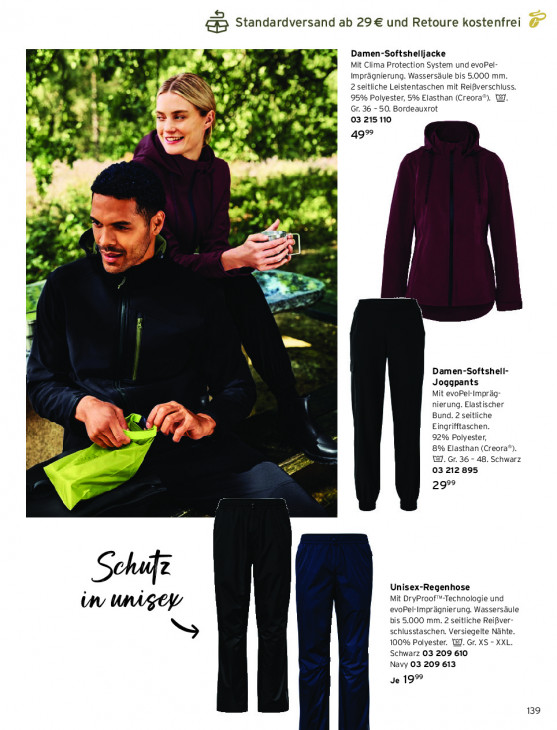 Bitte beachten Sie, dass dieser Text automatisch generiert wird und möglicherweise Fehler enthältæ Standardversand ab 29€ und Retoure kostenfrei De Damen-Softshelljacke u tn 8 r Mit Clima Protection System und evoPel- Li 3 Imprägnierung. Wassersäule bis 5.000 mm. N (LA 2 seitliche Leistentaschen mit Reißverschluss. 5 95% Polyester, 5% Elasthan (Creora®). @. Gr. 36 - 50. Bordeauxrot U 03 215 10 + fi 49° (Dn 19 LA 2% pee Dr Di » LE 4 Een |= Eu Damen-Softshell- Joggpants Mit evoPel-Impräg- nierung. Elastischer EN Bund. 2 seitliche Eingrifftaschen. 7 92% Polyester, 8% Elasthan (Creora®), WJ. Gr. 36 - 48. Schwarz 03 212 895 99 Unisex-Regenhose . Mit DryProof'-Technologie und in US evoPel-Imprägnierung. Wassersäule bis 5.000 mm. 2 seitliche Reißver- schlusstaschen. Versiegelte Nähte, 100% Polyester. WJ. Gr. XS - XXL. Schwarz 03 209 610 Navy 03 209 613 Je 19% 139