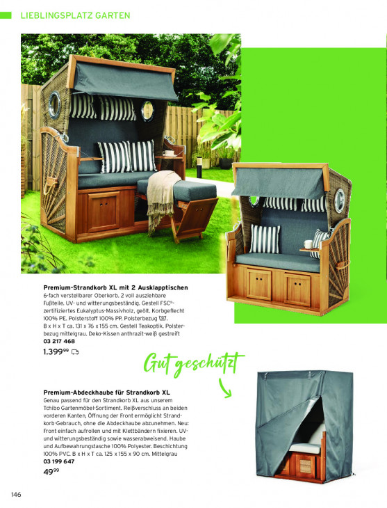 Bitte beachten Sie, dass dieser Text automatisch generiert wird und möglicherweise Fehler enthältA Le 4 = Br FR * RE bal se Fi Y ZW) ij K d AR En ng IIS S ASS MN eh I An 2 4 UNE À LN u 5 5 Ù mat |; 5 Es CI ul ur "a Em sen; j | a Premium-Strandkorb XL mit 2 Ausklapptischen 6-fach verstellbarer Oberkorb. 2 voll ausziehbare ] Fußteile. UV- und witterungsbeständig. Gestell FSC*- mn. > zertifiziertes Eukalyptus-Massivholz, geölt. Korbgeflecht 100% PE. Polsterstoff 100% PP. Polsterbezug 7. Bx Hx T ca. 131 x 76 x155 cm. Gestell Teakoptik. Polster- bezug mittelgrau. Deko-Kissen anthrazit-weiß gestreift 03 217 468 1.399® a Premium-Abdeckhaube für Strandkorb XL JE 11 Genau passend für den Strandkorb XL aus unserem Tchibo Gartenmöbel-Sortiment. Reißverschluss an beiden |E * We vorderen Kanten, Öffnung der Front ermöglicht Strand- korb-Gebrauch, ohne die Abdeckhaube abzunehmen. Neu: Front einfach aufrollen und mit Klettbändern fixieren. UV- und witterungsbeständig sowie wasserabweisend. Haube und Aufbewahrungstasche 100% Polyester. Beschichtung 100% PVC. B x H x T ca. 125 x155 x 90 cm. Mittelgrau 03 199 647 El 49° 146