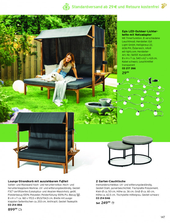 Bitte beachten Sie, dass dieser Text automatisch generiert wird und möglicherweise Fehler enthält— a er 5 si en 0 5 N $ Er SE 4 7 Eh Je ME ER Én Ee N Ees ik À Pac EN De Im 3 = Se ÿ Sy: BS 2 ES = Pas en EL Eglo LED-Outdoor-Lichter- a) FT L: fs sn kette mit Netzadapter Fr Mit Timerfunktion. 8 verschiedene we re Leuchtmodi. Hersteller: Edi AT, A: fi Light GmbH, Heiligkreuz 22, REY “À 6136 Pill, Österreich, info@ si] edi-light.com. Hersteller- \ S 5 | Art. 56937. Kunststoff. PS BxHxT ca. 540 x 67 x 4,8 cm. | l Kabel schwarz. Leuchtmittel transparent > À 03 217 266 | 2 | | | 292 7 Gera: = rn as bd =” ar = nn ug a È I RU in ja . Pa Sn Ee zn hd en +: à nn LT us Nr. À be Ap GR " = À Lounge-Strandkorb mit ausziehbarem Fußteil 2 Garten-Couchtische Seiten- und Rückwand hoch- und herunterrollbar. Hoch- und Ineinanderschiebbar. UV- und witterungsbeständig. herunterklappbare Markise. UV- und witterungsbeständig. Gestell Gestell Stahl, pulverbeschichtet. Tischplatte Polyzement. FSC*zertifiziertes Eukalyptus- und Akazien-Massivholz, geölt. Klein ® ca. 50 cm, Höhe ca. 36. cm. Groß ® ca. 60 cm, Polsterbezug 100% Polyester. Polsterfüllung 100% PU. Bezug I. Höhe ca. 42,5 cm. Tischplatte mitteigrau. Gestell schwarz BXHXT ca. 160 x 170,5 x 85,5/154,5 cm. Breite mit ausge- 03 214 846 klappten Seitentischen ca. 203 cm. Anthrazit. Gestell Teakoptik Set 249° m 03 214 856 899% > 147