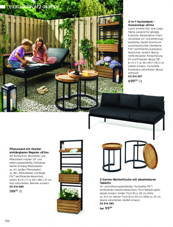 Bitte beachten Sie, dass dieser Text automatisch generiert wird und möglicherweise Fehler enthältee © FFT RE SE a ww Se ee à ve ej «2 IEBE PAC ol Lo {3 5 Wi EN EN EX À 2-in-1-Gartenbank - FT M \ 2 Sonnenliege »Elin« Leicht erhöhte Sitz- bzw. Liege- I fläche, passend für gängige F Lan Esstische. Rückenlehne 3-fach "Par | en verstellbar. UV- und witterungs- EE Tm 5 € E beständig. Gestell Aluminium, 3 Ë Er pulverbeschichtet. Stellfläche | | nz a FSC*-zertitiziertes Eukalyptus- = & Massivholz, lackiert. Bezug ) 100% Polyester. Polsterfüllung û PU und Polyester. Bezug A. A es BXH xT ca. 181 x 87,7 x 81,3 cm. = — Gestell schwarz. Tischplatte Ba = Eukalyptus naturfarben. Bezug Bir anthrazit 03 214 837 = = Fan Sed 699 > 5 3 = | En 5 IS z 4 re EE: Ere aa E 25 A RU Ne 4 = 2 BET 4 et E LE es Re =] & B Le = = Ben Er 4 © 2 ER = BER; Fe LS id Ek LE CAE A Re > 2 3: & 5 FR sr er) CLÉS BI A Pflanzwand mit flexibel il EE einhängbaren Regalen »Elin« Als Sichtschutz, Raumteiler und Pflanzwand nutzbar. UV- und witterungsbeständig. Füllmenge / kleiner Einhäng-Pflanzkasten — 4 ä ca. 14 |, groBer Pflanzkasten ca. 481. Pflanzkästen und Regal hu | FSC*-zertifiziertes Massivholz, lasiert. B xH xT ca. 60 x180 x 37 cm. en 2 Garten-Beistelltische mit abnehmbaren Holz naturfarben. Rahmen schwarz en Tabletts 03 214 860 UV- und witterungsbeständig. Tischplatte FSC®- L zertifiziertes Akazien-Massivholz, Tisch-Tabletts geölt, 199% & À Gestell lackiert. Großer Tisch ® ca. 50 cm, Höhe DE ca. 51,5 cm. Kleiner Tisch ® ca. 40 cm, Höhe ca. 47 cm. ‚Akazie naturfarben. Gestell schwarz 03 214 383 s_ Set 99° 150