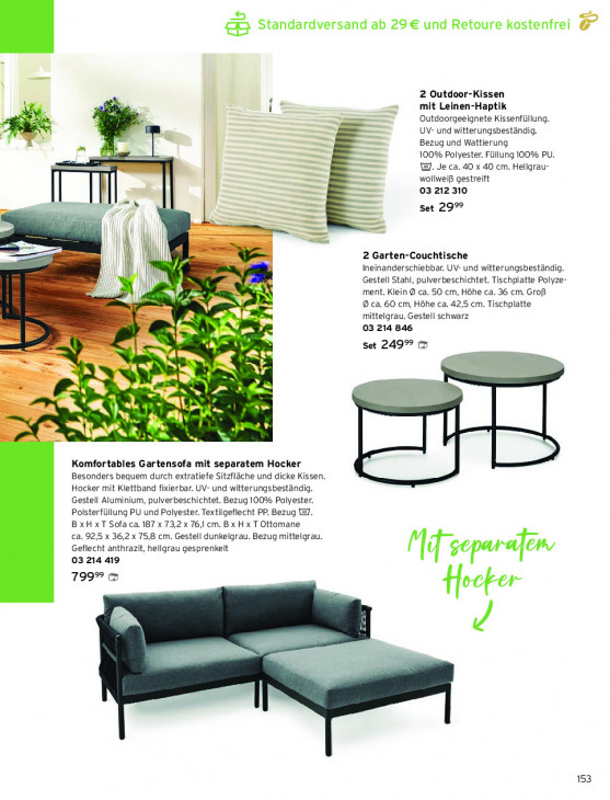 Bitte beachten Sie, dass dieser Text automatisch generiert wird und möglicherweise Fehler enthält& Standardversand ab 29€ und Retoure kostenfrei F 2 Outdoor-Kissen mit Leinen-Haptik Outdoorgeeignete Kissenfüllung. UV- und witterungsbeständig. Bezug und Wattierung 100% Polyester. Füllung 100% PU. WJ. Je ca. 40 x 40 cm. Hellgrau- wollweiß gestreift 03 212 310 mj Set 29% gs: |! = | = 2 Garten-Couchtische I Ineinanderschiebbar. UV- und witterungsbeständig. Gestell Stahl, pulverbeschichtet. Tischplatte Polyze- Il ment. Klein @ ca. 50 cm, Höhe ca. 36 cm. Groß 2 id 9 ca. 60 cm, Höhe ca. 42,5 cm. Tischplatte IE mittelgrau. Gestell schwarz Aj he 03 214 846 PEN _— Set 2499 7 ss SNL Are = nn LT + ut Nr a A Dan DA «il GT #4 aa Komfortables Gartensofa mit separatem Hocker Besonders bequem durch extratiefe Sitzfläche und dicke Kissen. Hocker mit Klettband fixierbar. UV- und witterungsbeständig. Gestell Aluminium, pulverbeschichtet. Bezug 100% Polyester. Polsterfüllung PU und Polyester. Textilgeflecht PP. Bezug TE]. BxHxT Sofa ca. 187 x 73,2 x 76,1 cm. B x H x T Ottomane ca. 92,5 x 36,2 x 75,8 cm. Gestell dunkelgrau. Bezug mittelgrau. Geflecht anthrazit, hellgrau gesprenkeit 03 214 419 Md zeparsfen 799 & footer ii = 153