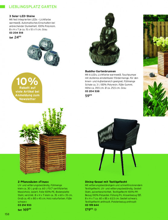 Bitte beachten Sie, dass dieser Text automatisch generiert wird und möglicherweise Fehler enthält3 Solar-LED-Steine Mit fest integrierten LEDs - Lichtfarbe KEA 3% warmweiß. Automatisches Einschalten bei anbrechender Dunkelheit. 100% Polyresin. Bx Hx T je ca. 15 x 10 x 1 cm. Grau 03 204 518 | Set 24°° a = Li Fe © = de 5 ie Buddha-Gartenbrunnen Mit 6 LEDs, Lichtfarbe warmweiB. Tauchpumpe an mit stufenlos einstellbarer Fördermenge. Für den Innen- und Außenbereich geeignet. Füllmenge Schale ca. 3 1.100% Polyresin. Füße Gummi. Höhe ca. 39,5 cm. @ ca. 25,5 cm. Grau 03 204 538 # 5999 $ 1% 2 Pr { VA? A) Y y 7 ip, W 2 W x u ; x À S 2 3 “ Xe ce A a: 5 Er BE Rae SR BA Al d | 7 A (LL IL NL = — 2 Pflanzsäulen »Tinus« Dining-Sessel mit Textilgeflecht UV- und witterungsbeständig. Füllmenge Mit witterungsbeständigem und schnelltrocknendem klein ca. 30 1, groß ca. 60 I. FSC*-zertifiziertes Textilgeflecht. UV- und witterungsbeständig. Gestell Massivholz, lasiert. Folie 100% PE. Bodenplatte Stahl, pulverbeschichtet. Textilgeflecht 100% PP. Stahl, verzinkt. Bx Hx Tklein ca. 35 x 60 x 35 cm. Bezug 100% Polyester. Füllung PU. Kissenbezug CA. BxH x T ca. 60 x 85 x 63,5 cm. Gestell schwarz. Grof ca. 45 x 80x 45 cm. Holz naturfarben. Füße schwarz Textilgeflecht anthrazit. Polsterbezug anthrazit 03 214 933 03199 644 Set 169% 179% & 158