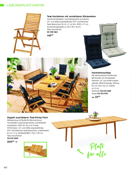 Bitte beachten Sie, dass dieser Text automatisch generiert wird und möglicherweise Fehler enthältEN LIEBLINGSPLATZ GARTEN Teak-Hochlehner mit verstellbarer Rückenlehne Zusammenklappbar und platzsparend verstaubar. UV- und witterungsbeständig. FSC*-zertifiziertes Teak-Massivholz. B x H x T ca. 56 x 109,5 x71 cm. — Zusammengeklappt ca. 56 x 94 x 16 cm. Teak naturfarben 03 198 563 149% Z. = Z ee To || N W ee Hochlehnerauflage Sy = Mit abnehmbarem Kopfkissen. A + (us Le Mit Kordeln am Stuhlgestell fixierbar. UV- und witterungsbe- ständig. 100% Polyester. Füllung 8 PU. Ca. 120 x 52 cm. Stärke N a ca. 5 cm. Anthrazit 03 213 068 Taupe 03 213 070 Je 39% v” * 4 Doppelt ausziehbarer Teak-Dining-Tisch Mittelauszug mit Butterfly-Mechanismus: Tischplatten auseinanderziehen und Mittelteil ausklappen. Platz für bis zu 6, 8 oder 10 Personen. UV- und witterungsbeständig. FSC®-zertifiziertes Teak-Massivholz, unbehandelt. Bx Hx T ca. 200/240/280 x 75,5 x 90 cm. Teak naturfarben 03 214 880 899% & Plafz pr alle 160