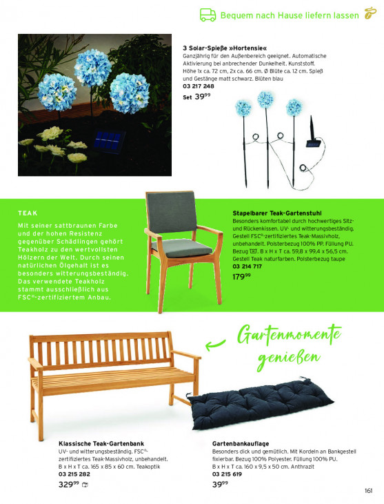 Bitte beachten Sie, dass dieser Text automatisch generiert wird und möglicherweise Fehler enthält3 Solar-Spieße »Hortensie« ab = Ganzjährig für den Außenbereich geeignet. Automatische ‚Aktivierung bei anbrechender Dunkelheit. Kunststoff. £ Höhe ix ca. 72 cm, 2x ca. 66 cm. D Blüte ca. 12 cm. Spieß 9 wk und Gestänge matt schwarz. Blüten blau 7 03 217 248 2 { Al Set 39°° # EL . is sz Ni € Q | e D — œ Stapelbarer Teak-Gartenstuhl Besonders komfortabel durch hochwertiges Sitz- und Rückenkissen. UV- und witterungsbeständig. Gestell FSC*-zertifiziertes Teak-Massivholz, unbehandelt. Polsterbezug 100% PP. Füllung PU. Bezug #1. B x H x T ca. 59,8 x 99,4 x 56,5 cm. Gestell Teak naturfarben. Polsterbezug taupe 03 214 717 179% LTTEEEITETEN! — = Klassische Teak-Gartenbank Gartenbankauflage UV- und witterungsbeständig. FSC®- Besonders dick und gemütlich. Mit Kordeln an Bankgestell zertifiziertes Teak-Massivholz, unbehandelt. fixierbar. Bezug 100% Polyester. Füllung 100% PU. Bx HxT ca. 165 x 85 x 60 cm. Teakoptik Bx Hx T ca. 160 x 9,5 x 50 cm. Anthrazit 03 215 282 03 215 619 329% & 399° 161
