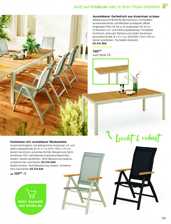 Bitte beachten Sie, dass dieser Text automatisch generiert wird und möglicherweise Fehler enthältJetzt auf tchibo.de oder in Ihrer Filiale bestellen Ausziehbarer Gartentisch aus Aluminium »Liska« Mittelauszug mit Butterfly-Mechanismus, Tischplatten auseinanderziehen und Mittelteil ausklappen. Bietet eingezogen Platz für bis zu 8, ausgezogen für bis zu 12 Personen. UV- und witterungsbeständig. Tischplatte ‚Aluminium, bedruckt. Rahmen und Gestell Aluminium, = pulverbeschichtet. B x H x T ca. 204/300 x 74,5 x 95 cm. Re Gestell sandfarben. Tischplatte Holzoptik 03 214 396 À | 749°° | En fi I statt 799,99 [3 == Seg em A | ® va à see u | ‘ N LA Hochlehner mit verstellbarer Rückenlehne N feichf rea Zusammenklappbar und platzsparend verstaubar. UV- und witterungsbeständig. B x H x T ca. 61,9 x 107,2 x 711 cm. Gestell Aluminium, pulverbeschichtet. Bespannung Textil. Armlehnen FSC®-zertifiziertes Eukalyptus-Massivholz, lackiert. Gestell sandfarben. Textil-Bespannung hellgrau. ‚Armlehne Holz naturfarben 03 214 840 Gestell schwarz. Textil-Bespannung schwarz. Armlehne Holz naturfarben 03 214 841 Je 1699 7 a W .. Mehr Auswahl auf tchibo.de 163