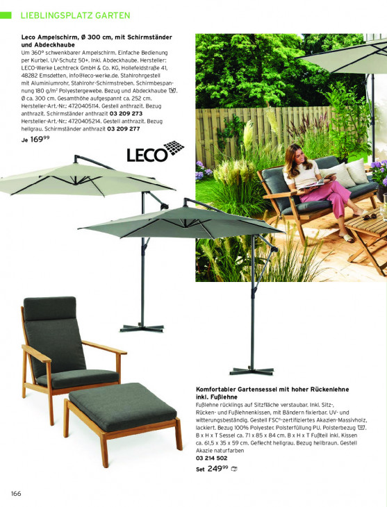 Bitte beachten Sie, dass dieser Text automatisch generiert wird und möglicherweise Fehler enthältLIEBLINGSPLATZ GARTEN Leco Ampelschirm, @ 300 cm, mit Schirmständer und Abdeckhaube A en x jk. nn Um 360° schwenkbarer Ampelschirm. Einfache Bedienung per Kurbel. UV-Schutz 50+. Inkl. Abdeckhaube. Hersteller: LECO-Werke Lechtreck GmbH & Co. KG, Hollefeldstraße 41, 48282 Emsdetten, [email protected]. Stahlrohrgestell Nr mit Aluminiumrohr, Stahlrohr-Schirmstreben. Schirmbespan- nung 180 g/m? Polyestergewebe. Bezug und Abdeckhaube WW, Pe à 9 ca. 300 cm. Gesamthôhe aufgespannt ca. 252 cm. x Hersteller-Art.-Nr: 472040514. Gestell anthrazit. Bezug CS anthrazit. Schirmständer anthrazit 03 209 273 Te \ id Re at Hersteller-Art.-Nr: 4720405214. Gestell anthrazit. Bezug ll ie PA Dj Tike \ il ni N hellgrau. Schirmständer anthrazit 03 209 277 Nt \ N (1, a A Je 169°° X * pe z Ë M 4 ne à F 1 < m LECO he, = N x \ N 4 > 3 + x — Rm n 5 N 1 l # ne $ hi Al if N) < | à) IN, | ( 1 7 C2 a Nu ij H IL | A % IK u Komfortabler Gartensessel mit hoher Rückenlehne inkl. Fußlehne Fußlehne rücklings auf Sitzfläche verstaubar. Inkl. Sitz-, Rücken- und Fußlehnenkissen, mit Bändern fixierbar. UV- und witterungsbeständig. Gestell FSC*-zertifiziertes Akazien-Massivholz, lackiert. Bezug 100% Polyester. Polsterfüllung PU. Polsterbezug LJ. BxH x T Sessel ca. 71 x 85 x 84 cm. B x H x T Fufteil inkl. Kissen ca. 61,5 x 35 x 59 cm. Geflecht hellgrau. Bezug hellbraun. Gestell Akazie naturfarben 03 214 502 Set 249% 166