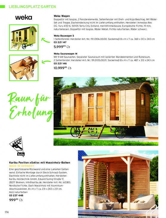 Bitte beachten Sie, dass dieser Text automatisch generiert wird und möglicherweise Fehler enthältEN LIEBLINGSPLATZ GARTEN Weka Wagen weka Doppeltür mit Isoglas, 2 Fensterelemente, Seitenfenster mit Dreh- und Kipp-Beschlag. Mit Räder- Set und Treppe. Dacheindeckung nicht im Lieferumfang enthalten. Hersteller: Inmedias Res OÙ, Turu 47/2-6, 50105 Tartu City, Estland, [email protected]. Europäische Fichte, 19 mm, naturbelassen. Doppeltür mit Isoglas. Räder Metall. Fichte naturfarben. Räder schwarz. I Weka Bauwagen S 1 Seitenfenster. Hersteller-Art.-Nr: 191.0106.00.00. Sockelmaß Bx Hx T ca. 360 x 313 x 243 cm 03 221147 x F 5,999 0 Weka Saunawagon M Mit 9-kW-Saunaofen. Separater Saunaraum mit isolierten Wandelementen und Ruheraum. 2 Seitenfenster. Hersteller-Art-Nr.: 191.0105.00.01. SockelmaB B x H x T ca. 487 x 313 x 243 cm 03 221146 10.999% D v A à À 3 te De 2 2 Æ Lil: Pan für N | | hi ; a ua N7 LAINE = ES À == AL, EEE TE Karibu Pavillon »Sotis« mit Massivholz-Balken 4 Eine geschlossene Rückwand und eine Lamellen-Seiten- wand. Einfache Montage durch Steck-Schraub-System. Dachfolie nicht im Lieferumfang enthalten. Hersteller N Karibu Holztechnik GmbH, Eduard-Suling-Straße 17, | 28217 Bremen, [email protected]. Hersteller-Art. : 60383, —. Nordische Fichte. Dach Massivholz mit Aluminium- = Pr Abschlussleisten. B x H x T ca. 231 x 243 x 231 cm. Holz naturfarben = X RSS 03 237 448 7 BESPPEFFEFFEEN RUN 5:3 AN ij 999% 0 ION x. Ä ZU 174 ms Me