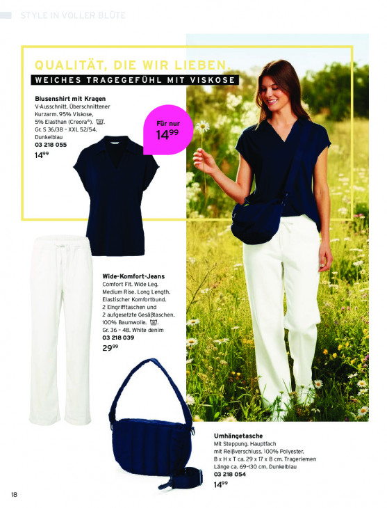 Bitte beachten Sie, dass dieser Text automatisch generiert wird und möglicherweise Fehler enthältWEICHES TRAGEGEFÜHL M IT VISKOSE DN Blusenshirt mit Kragen +. w V-Ausschnitt. Überschnittener N Kurzarm. 95% Viskose, + 5% Elasthan (Creora®). @. de Gr. S 36/38 - XXL 52/54. Dunkelblau 4 03 218 055 14% E DS N Wide-Komfort-Jeans ya W & N Comfort Fit. Wide Leg. & Medium Rise. Long Length. a A dr x. Elastischer Komfortbund. è f ë 2 Eingrifftaschen und Ft h A 2 aufgesetzte Gesäßtaschen. ni AU 100% Baumwolle. WJ. a‘ Gr. 36 - 48. White denim A W 03 218 039 x pes 29% ú EN N en % Et FA N > A Al EN na IN he Ta LT À à A a Ls Umhängetasche Mit Steppung. Hauptfach mit Reißverschluss. 100% Polyester. Bx Hx T ca. 29 x 17 x 8 cm. Trageriemen Länge ca. 69-130 cm. Dunkelblau 03 218 054 1499 18