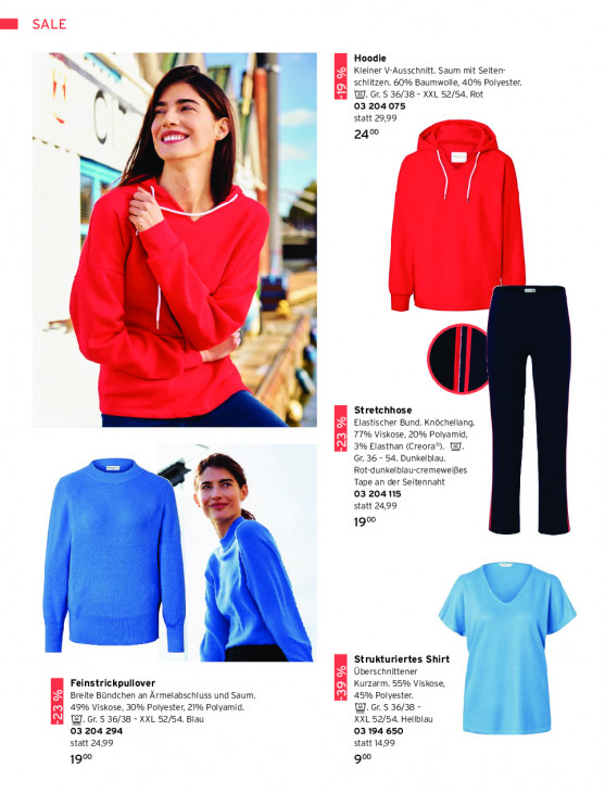 Bitte beachten Sie, dass dieser Text automatisch generiert wird und möglicherweise Fehler enthältEN SALE NS Hoodie Kleiner V-Ausschnitt. Saum mit Seiten- 4 schlitzen. 60% Baumwolle, 40% Polyester. HN A WI. Gr. S 36/38 - XXL 52/54. Rot | 03 204075 statt 29,99 24% >. * # IT 2 | Stretchhose Elastischer Bund. Knöchellang. 77% Viskose, 20% Polyamid, 3% Elasthan (Creora®). @J. R Gr. 36 - 54. Dunkelblau. Rot-dunkelblau-cremeweißes Tape an der Seitennaht 03 204115 statt 2499 goo Strukturiertes Shirt Überschnittener Feinstrickpullover Kurzarm. 55% Viskose, PS Breite Bündchen an Ärmelabschluss und Saum. -39 % 45% Polyester. M] 49% Viskose, 30% Polyester, 21% Polyamid. W. Gr. S 36/38 - IN] W. cr. S 36/38 - XXL 52/54. Blau XXL 52/54, Hellblau 03 204 294 03194 650 statt 24,99 statt 14,99 goo 900