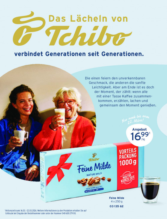 Bitte beachten Sie, dass dieser Text automatisch generiert wird und möglicherweise Fehler enthältDas Lächeln von # Ce T verbindet Generationen seit Generationen. D" cc Die einen feiern den unverkennbaren mn 1 Geschmack, die anderen die sanfte Leichtigkeit. Aber am Ende ist es doch der Moment, der zählt: wenn alle mit einer Tasse Kaffee zusammen- C7 kommen, erzählen, lachen und gemeinsam den Moment genießen. > Angebot 99 16 ka . Me PACKUN Tchibo 10009 Mi NATUR-MILD AR vR LEN Ee © ® Len x ‚m rcnno ale a Feine Milde 4x2509 03135 62 “Aktionszeitraum: 16.03.-22.03.2026. Weitere Informationen zu den Produkten erhalten Sie auf, tchibode bei Eingabe der Bestellnummer oder unter der Nummer 040-600 279 00.