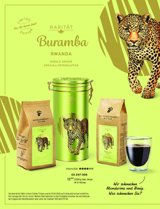 Bitte beachten Sie, dass dieser Text automatisch generiert wird und möglicherweise Fehler enthälta NITEO o. 4 kure® 2 DS Nur fü oe RARITÄT u As It Eon? & ib te, LS } a 2 Sy ya N Buramka œ À eve! R en „ee RWANDA SEHE NS val 5 SINGLE ORIGIN AS SPEZIALITÂTENKAFFEE » tg „ Je, (D ee | N Gar fr Gi Hu RAF CEE EN seu) N su N 5 S 2 ser wap ih eh N fé ne RAR; É If T, ne “is Se 7 Komi Î N ZE fi ; Sa \ N Br Burana su a Hi ee, ES ü Intensität 66666 03 247 008 129° /250g inkl. Dose (€ 51.96/k9) Release” Mandarine und Honig. ‘Ab dem 16.03.2026 in Ihren Tchibo Filialen und ab 23.03.2026 auf tchibo de/raritaet erhältlich. Was schmecken Sie? Nur solange der Vorrat reicht. Weitere Informationen zu den Produkten erhalten Sie auf tchibo.de bei Eingabe der Bestelnummer oder unter der Nummer 040-600 279 00.