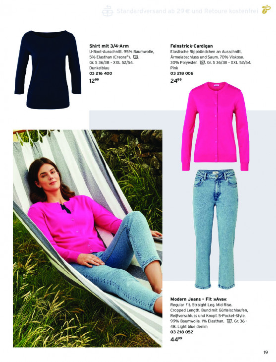 Bitte beachten Sie, dass dieser Text automatisch generiert wird und möglicherweise Fehler enthältShirt mit 3/4-Arm Feinstrick-Cardigan U-Boot-Ausschnitt. 95% Baumwolle, Elastische Rippbündchen an Ausschnitt, 5% Elasthan (Creora®). WD. Armelabschluss und Saum. 70% Viskose, Gr. S 36/38 - XXL 52/54. 30% Polyester. W. Gr. S 36/38 - XXL 52/54. Dunkelblau Pink 03 216 400 03 218 006 12% 24° > = + W $ % SS, % N NES =) I Ss = 3 à Ÿ N N gi N à si N A À mä er TS 472 Dn > ze | N = | » +6 LS ; 5 À fi 4 de Modern Jeans - Fit »Ava« tl ut Regular Fit. Straight Leg. Mid Rise. Cropped Length. Bund mit Gürtelschlaufen, Reißverschluss und Knopf. 5-Pocket-Style. 99% Baumwolle, 1% Elasthan. WJ. Gr. 36 - 48. Light blue denim 03 218 052 LE 499 19