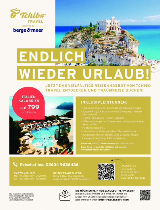 Bitte beachten Sie, dass dieser Text automatisch generiert wird und möglicherweise Fehler enthält{N Make tiliri = (Ten. berge & meer Be 2% re a ER RUE Rd oe 70 EA : rd Ai a + IT a ra FA Eet = AE RS 1 E 2 ITALIEN KALABRIEN ab€ 799 CASE = Be P er Ne RES 7 Lt » OH = ei = SIE MÖCHTEN KEIN REISEANGEBOT VERPASSEN? Eine Kooperation der Tchibo GmbH, Bleiben Sie informiert und erfahren immer als Überseerng18,22297 Hamburg und Berge & Meer Touristik Gmbh, Erstes von unseren neuesten Reisehighlights - Andıestraße27,S65TBRengstort jetzt anmelden unter tchibo-travel.de/newsletter!