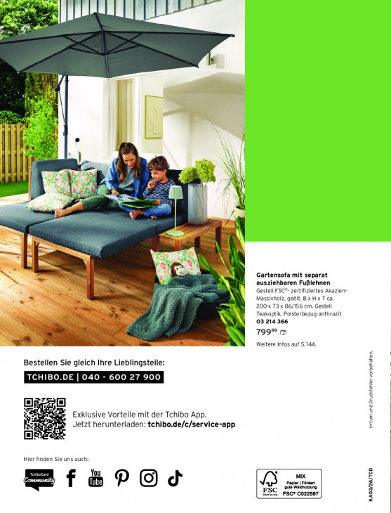 Bitte beachten Sie, dass dieser Text automatisch generiert wird und möglicherweise Fehler enthält2 ee | \ | KS 17 > \ I Ô NS S} Gartensofa mit separat ausziehbaren Fußlehnen Gestell FSC*- zertifiziertes Akazien- Zi 200 x 73x 86/156 cm. Gestell Massivholz, geölt. Bx H x T ca. N Teakoptik. Polsterbezug anthrazit te 03 214 366 799% & Weitere Infos auf 5.144. Bestellen Sie gleich Ihre Lieblingsteile: Exklusive Vorteile mit der Tchibo App. Jetzt herunterladen: tchibo.de/c/service-app Irrtum und Druckfehler vorbehalten. or Hier finden Sie uns auch: You MIX W Welsnuzung er | Fördert Bf&POd ESC mn FSC® CO22507 KAO3/26/TCD