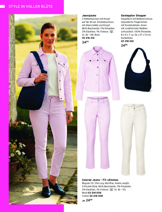 Bitte beachten Sie, dass dieser Text automatisch generiert wird und möglicherweise Fehler enthältJeansjacke Gesteppter Shopper 2 Pattentaschen mit Knopf Hauptfach mit Reißverschluss. A auf der Brust. Ärmelabschluss Gepolsterte Trageriemen mit Manschette und Knopf. mit Knotendetails. Innen 86% Baumwolle, 11% Polyester, mit zusätzlichem Reißver- 2% Elasthan, 1% Viskose. &J. schlussfach. 100% Polyester. ”% Gr. 36 - 48. Rosé Bx Hx T ca, 36 x 27 «10 cm. } 03 216 412 Dunkelblau x ze Î 03 218 061 ad ua 34° AL 24” u x u = à Au je ker î À 7 Bo an Le HA KA — ar B [3 EN x Colored Jeans - Fit »Emma« Es = Regular Fit. Slim Leg. Mid Rise. Ankle Length. 5 5-Pocket-Style. 86% Baumwolle, 11% Polyester, N ei Je > 2% Elasthan, 1% Viskose. WJ. Gr. 36 - 50. Rosé 03 218 008 Creme 03 218 009 ca Je 24% EE