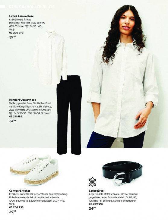Bitte beachten Sie, dass dieser Text automatisch generiert wird und möglicherweise Fehler enthältLange Leinenbluse Krempelbare Ärmel, mit Riegel fixierbar. 55% Leinen, 45% Viskose. @. Gr. 36-46, Weiß 03 205 972 399 Komfort-Jerseyhose Weites, gerades Bein. Elastischer Bund. Seitliche Eingrifftaschen. 62% Viskose, 35% Polyester, 3% Elasthan (Creora®). WI. Gr. 5 36/38 - XXL 52/54. Schwarz 03 211 692 2499 Ba > a w … 4 SE ERE = I 5 Canvas-Sneaker Ledergürtel Erhöhte Laufsohle mit geflochtener Bast-Umrandung. Abgerundete Metalischnalle. 100% chromfrei Rutschhemmende, leicht profilierte Laufsohle. gegerbtes Leder. Schnalle Metall. Gr. 85, 95, 100% Baumwolle. Laufsohle Kunststoff. Gr. 37 - 42. 105 bzw. 115. Schwarz. Schnalle silberfarben Weiß 03 209 913 03 206 235 4° 399