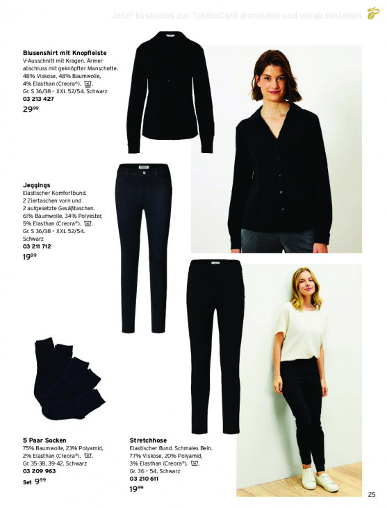Bitte beachten Sie, dass dieser Text automatisch generiert wird und möglicherweise Fehler enthältBlusenshirt mit Knopfleiste V-Ausschnitt mit Kragen. Ärmel- abschluss mit geknëpfter Manschette. 48% Viskose, 48% Baumwolle, 4% Elasthan (Creora®). @. Gr. S 36/38 - XXL 52/54, Schwarz we 03 213 427 29° Jeggings Elastischer Komfortbund. 2 Ziertaschen vorn und 2 aufgesetzte Gesäßtaschen. 61% Baumwolle, 34% Polyester, 5% Elasthan (Creora®). @. Gr. S 36/38 - XXL 52/54. Schwarz 03 211 712 999 u mn 5 Paar Socken Stretchhose Elastischer Bund. Schmales Bein. 75% Baumwolle, 23% Polyamid, 2% Elasthan (Creora®). WJ. 77% Viskose, 20% Polyamid, Gr. 35-38, 39-42. Schwarz 3% Elasthan (Creora®). @. 03 209 963 Gr. 36 - 54. Schwarz 03 210 611 set 999 199 A > 25