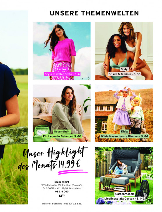 Bitte beachten Sie, dass dieser Text automatisch generiert wird und möglicherweise Fehler enthältUNSERE THEMENWELTEN = N > | ‚| Body: ur h & fet S.30 u WE à 2 —y 5 UE ç Fi (jf Ee 1 A Ca undheit: k 4 ids: = #4 Wilde H: bunt Blumen Ein Leben in Balance L S.60 1, u ar IS ir Gen N KA tt nser À 6% Monafz 14,99€ | D m Blusenshirt 98% Polyester, 2% Elasthan (Creora®). Gr. S 36/38 - XXL 52/54. Dunkelblau 03 218 040 zál Gartenmöbel: | F7 + 14% Ee Lieblingsplatz Garten: 5.142 & er Weitere Farben und Infos auf S.8 & 15.