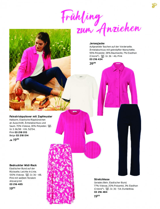 Bitte beachten Sie, dass dieser Text automatisch generiert wird und möglicherweise Fehler enthältJerseyjacke Aufgesetzte Taschen auf der Vorderseite. Armelabschluss mit geknöpfter Manschette. 55% Polyester, 38% Baum wolle, 7% Elasthan (Creora®). W. Gr. 36 - 46. Pink 03 216 434 39% CA Z 1m à ge LAN Br À = ME. De 21 ÿ Feinstrickpullover mit Zopfmuster Halbarm. Elastische Rippbündchen an Ausschnitt, Ärmelabschluss und Saum. 70% Viskose, 30% Polyester. TE]. Gr. S 36/38 - XXL 52/54. Pink 03 218 013 Beige 03 218 014 Je 19° Bedruckter Midi-Rock Elastischer Bund auf der Rückseite. Leichte A-Linie. 100% Viskose. @. Gr. 36 - 48. Pink mit weißem floralem Stretchhose Alloverprint 03 216 485 Gerades Bein. Elastischer Bund. 77% Viskose, 20% Polyamid, 3% Elasthan 199 | A (Creora®). WJ. Gr. 36 - 54. Dunkelblau 03 216 484 199 L Fam Zr