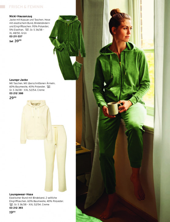 Bitte beachten Sie, dass dieser Text automatisch generiert wird und möglicherweise Fehler enthältNicki-Hausanzug Jacke mit Kapuze und Taschen. Hose mit elastischem Bund, Bindebändern und Eingrifftaschen. 95% Polyester, 5% Elasthan. WJ. Gr. S 36/38 - XL 48/50. Grün | 1 03 211 037 Ser 399° A N = Ÿ fl 4 | # Lounge-Jacke Mit Taschen. Mit überschnittenen Ärmeln. 60% Baumwolle, 40% Polyester. @. > Gr. S 36/38 - XXL 52/54. Creme ‘ u 03 212 388 ) % 29° — Q 1 “ Loungewear-Hose Elastischer Bund mit Bindeband. 2 seitliche Eingrifftaschen. 60% Baumwolle, 40% Polyester. WJ. Gr. $ 36/38 - XXL 52/54. Creme 03 212 393 ges