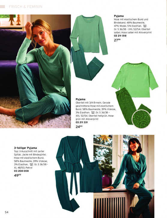 Bitte beachten Sie, dass dieser Text automatisch generiert wird und möglicherweise Fehler enthältPyjama Hose mit elastischem Bund und Bindeband. 48% Baumwolle, TA 47% Modal, 5% Elasthan. WJ. er‘ Gr. S 36/38 - XXL 52/54. Oberteil salbei. Hose salbei mit Alloverprint 03 211 018 LS 27% 4 Pl 9 | Lo j = >> Pyjama Oberteil mit 3/4-Ärmeln. Gerade geschnittene Hose mit elastischem u Bund. 58% Baumwolle, 39% Viskose, 3% Elasthan. W. Gr. S 36/38 - XXL 52/54. Oberteil hellgrün. Hose i et grün mit Alloverprint AE 03 211 331 =) % ss > a EURE 24° I Be Me 3-teiliger Pyjama Top: V-Ausschnitt mit zarter ce Spitze. Jacke mit Bindegürtel. T Hose mit elastischem Bund. eh 1 JS à ) 58% Baumwolle, 39% Viskose, 3% Elasthan. WJ. Gr. S 36/38 - Kie u XL 48/50. Petrol PAL: oe 03 208 008 IN 99 72 À == IT | Il | . III 54