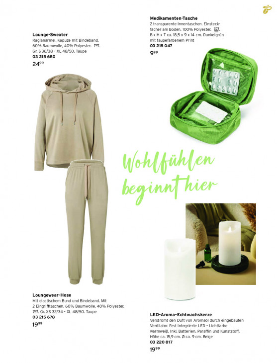 Bitte beachten Sie, dass dieser Text automatisch generiert wird und möglicherweise Fehler enthältMedikamenten- sche 2 transparente Innentaschen. Einsteck- fächer am Boden. 100% Polyester. WJ. Lounge-Sweater BxHxT ca. 18,5 x 9 x 14 cm. Dunkelgrün Raglanärmel. Kapuze mit Bindeband. mit taupefarbenem Print 60% Baumwolle, 40% Polyester. T1. 03 215 047 Gr. 5 36/38 - XL 48/50. Taupe 99 03 215 680 49° “ . Loungewear-Hose Mit elastischem Bund und Bindeband. Mit — 2 Eingrifftaschen. 60% Baumwolle, 40% Polyester. Wal. Gr. XS 32/34 - XL 48/50. Taupe LED-Aroma-Echtwachskerze 03 215 678 Verströmt den Duft von Aromaöl durch eingebauten 19% Ventilator, Fest integrierte LED - Lichtfarbe warmweiß. Inkl. Batterien. Paraffin und Kunststoff. Höhe ca. 15,9 cm. 9 ca. 9 cm. Beige 03 220 817 1999