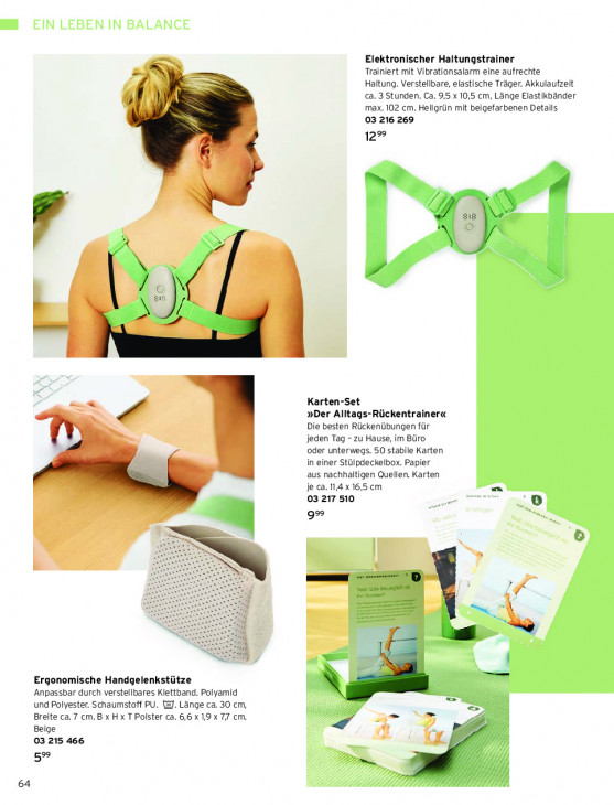 Bitte beachten Sie, dass dieser Text automatisch generiert wird und möglicherweise Fehler enthältElektronischer Haltungstrainer Trainiert mit Vibrationsalarm eine aufrechte Ik Haltung. Verstellbare, elastische Träger. Akkulaufzeit ca. 3 Stunden. Ca. 9,5 x 10,5 cm, Länge Elastikbänder max. 102 cm. Hellgrün mit beigefarbenen Details 03 216 269 12% : A EE 9 À Ne ) ? Karten-Set »Der Alltags-Rückentrainer« à € Die besten Rückenübungen für jeden Tag - zu Hause, im Büro oder unterwegs. 50 stabile Karten in einer Stülpdeckelbox. Papier aus nachhaltigen Quellen, Karten je ca. 1,4 x 16,5 cm 03 217 510 © 9% ss sereen ot: uen if | ss Ergonomische Handgelenkstütze Anpassbar durch verstellbares Klettband. Polyamid und Polyester. Schaumstoff PU. @. Länge ca. 30 cm, Breite ca. 7 cm.B x H x T Polster ca. 6,6 x 19 x 77 cm. Beige 7 03 215 466 (X 5» = 64