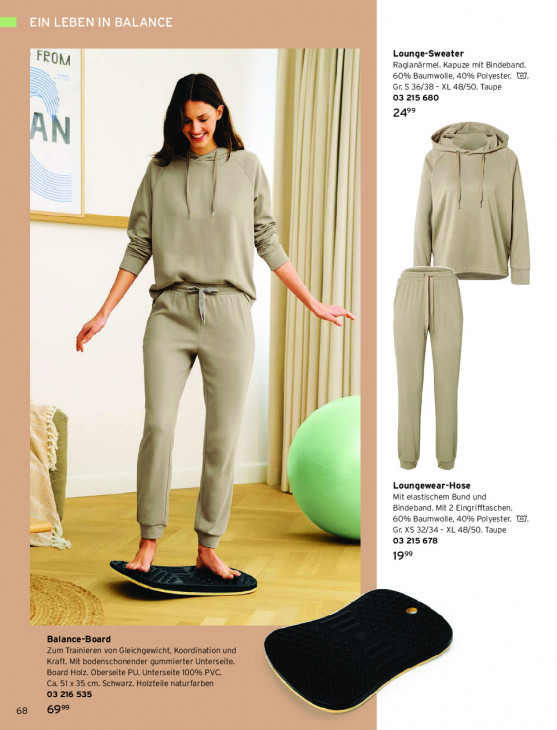 Bitte beachten Sie, dass dieser Text automatisch generiert wird und möglicherweise Fehler enthältLounge-Sweater FROM Raglanärmel. Kapuze mit Bindeband. 60% Baumwolle, 40% Polyester. WJ. Gr. S 36/38 - XL 48/50. Taupe 03 215 680 499 = E AN N = 1 | Lai | L a N | N 8 a > en ik 74 ee E Loungewear-Hose Mit elastischem Bund und Bindeband. Mit 2 Eingrifftaschen. 60% Baumwolle, 40% Polyester. T1. Gr. XS 32/34 - XL 48/50. Taupe 03 215 678 1999 Balance-Board Zum Trainieren von Gleichgewicht, Koordination und Kraft. Mit bodenschonender gummierter Unterseite. Board Holz. Oberseite PU. Unterseite 100% PVC. Ca. 51 x 35 cm. Schwarz. Holzteile naturfarben 03 216 535 68 69%