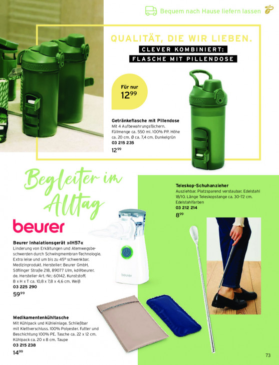 Bitte beachten Sie, dass dieser Text automatisch generiert wird und möglicherweise Fehler enthälten N Für nur 7) 1222 pi Getränkeflasche mit Pillendose Mit 4 Aufbewahrungsfächern. Fülimenge ca. 550 ml. 100% PP. Höhe ca. 20 cm. © ca. 7,4 cm. Dunkelgrün 03 215 235 12% i Teleskop-Schuhanzieher Ausziehbar. Platzsparend verstaubar. Edelstahl 18/10. Länge Teleskopstange ca. 30-72 cm. Edelstahlfarben 03 212 214 ® 8 beurer Beurer Inhalationsgerät »IH57« Linderung von Erkältungen und Atemwegsbe- schwerden durch Schwingmembran-Technologie. Extra leise und um bis zu 45° schwenkbar. Medizinprodukt. Hersteller: Beurer GmbH, Söflinger Straße 218, 89077 Ulm, kd@beurer. | de. Hersteller-Art. 60142. Kunststoff. BXH xT ca. 10,8 x 7,8 x 4,6 cm. Wei 03 225 290 599 | \ \\ Medikamentenkühltasche Mit Kühlpack und Kühleinlage. Schließbar mit Klettverschluss. 100% Polyester. Futter und | Beschichtung 100% PE. Tasche ca. 22 x 12 cm. Kühlpack ca. 20 x 8 cm. Taupe 03 215 238 | 14% 73