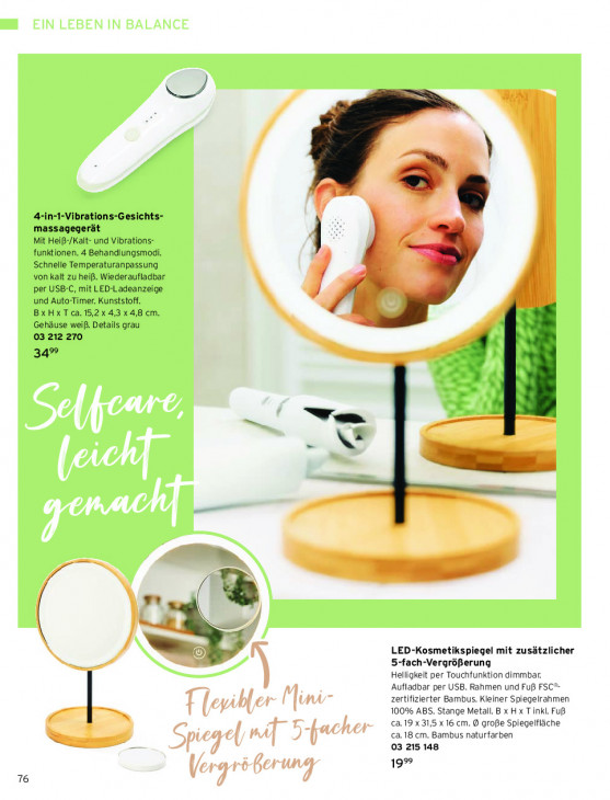 Bitte beachten Sie, dass dieser Text automatisch generiert wird und möglicherweise Fehler enthält| 4-in- -Vibrations-Gesichts- massagegerät Mit Heiß-/Kalt- und Vibrations- funktionen. 4 Behandlungsmodi. Schnelle Temperaturanpassung von kalt zu heiß. Wiederaufladbar per USB-C, mit LED-Ladeanzeige und Auto-Timer. Kunststoff. BXHXT ca.15,2x 4,3 x4,8 cm. Gehäuse weiß. Details grau 03 212 270 34% Tom. 1m LED-Kosmetikspiegel mit zusätzlicher a 5-fach-Vergrößerung Helligkeit per Touchfunktion dimmbar. Aufladbar per USB. Rahmen und Fu FSC“ zertifizierter Bambus. Kleiner Spiegelrahmen Tlevibler | mi” 100% ABS. Stange Metall. B x H x T inkl. Fuß in c2.19 x31,5 x 16cm. @ große Spiegelfläche ca.18.cm. Bambus naturfarben Sa Spiegel mi 5-facher 03 215 148 19% 76 gr Berung