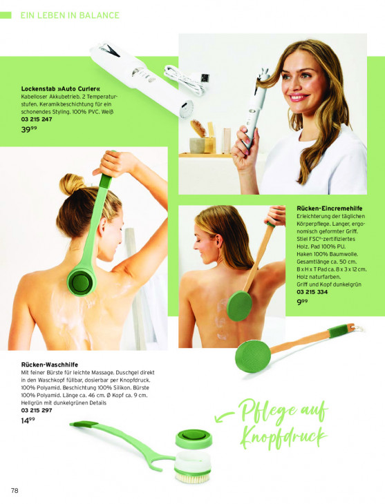 Bitte beachten Sie, dass dieser Text automatisch generiert wird und möglicherweise Fehler enthältA Le M Lockenstab »Auto Curler« Kabelloser Akkubetrieb. 2 Temperatur- stufen. Keramikbeschichtung für ein schonendes Styling. 100% PVC. Weiß © 03 215 247 / 99 AT &2 Mn … | Rücken-Eincremehilfe Erleichterung der täglichen Körperpflege. Langer, ergo- nomisch geformter Griff. Stiel FSC*-zertifiziertes Holz. Pad 100% PU. Haken 100% Baumwolle. Gesamtlänge ca. 50 cm. 21 BxHxTPadca.Bx3x12cm. Holz naturfarben. Griff und Kopf dunkelgrün 03 215 334 ge # Ee ss” Rücken-Waschhilfe y — Mit feiner Bürste für leichte Massage. Duschgel direkt in den Waschkopf füllbar, dosierbar per Knopfdruck. 100% Polyamid. Beschichtung 100% Silikon. Bürste 100% Polyamid. Länge ca. 46 cm. © Kopf ca. 9 cm. Hellgrün mit dunkelgrünen Details 03 215 297 499 mn 78