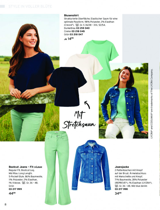 Bitte beachten Sie, dass dieser Text automatisch generiert wird und möglicherweise Fehler enthältBlusenshirt Strukturierte Oberfläche. Elastischer Saum für eine optimale Passform. 98% Polyester, 2% Elasthan (Creora®). 1]. Gr. S 36/38 - XXL 52/54. Dunkelblau 03 218 040 Creme 03 218 045 Grün 03 218 047 Je 149° » | z FE ous | 5e nj F va > N hi en ie Ô | el N i | N Md Ae 7 , m ee ) N € Shaun ré el f | LS 4 l LYCRA® and COOLMAX® are trademarks of The LYCRA Company. A | Ë he = 13 5 = ne A | Ë Bootcut Jeans - Fit »Lou« Jeansjacke 7 Regular Fit. Bootcut Leg. 3 2 Pattentaschen mit Knopf Mid Rise. Long Length. auf der Brust. Ärmelabschluss 5-Pocket-Style. 86% Baumwolle, a El mit Manschette und Knopf. 11% Polyester, 2% Elasthan, ei 71% Baumwolle, 28% Polyester 1% Viskose. W. Gr. 36 - 48. À ; (REPREVE®), 1% Elasthan (LYCRA®). Grün ed - WI. Gr. 36 - 48. Mid blue denim 03 217 999 03 217 998 44% 34%