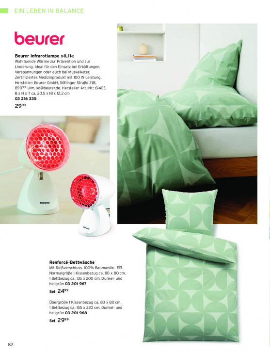 Bitte beachten Sie, dass dieser Text automatisch generiert wird und möglicherweise Fehler enthältEN EIN LEBEN IN BALANCE beurer _d Beurer Infrarotlampe »1L11« Wohltuende Wärme zur Prävention und zur Linderung. Ideal für den Einsatz bei Erkältungen, Verspannungen oder auch bei Muskelkater. Zertifiziertes Medizinprodukt mit 100 W Leistung. Hersteller: Beurer GmbH, Söflinger Straße 218, 89077 Ulm, [email protected]. Hersteller-Art.-Nr: 61403. BxHxT ca. 20,5 x18 x12,2 cm z 03 216 335 29° - En 5 / ® 5 ID 7 a Renforcé-Bettwäsche Mit Reißverschluss. 100% Baumwolle. tl. Normalgröße 1 Kissenbezug ca. 80 x 80 cm. 1 Bettbezug ca. 135 x 200 cm. Dunkel- und hellgrün 03 201 967 Set 2499 Übergröße 1 Kissenbezug ca. 80 x 80 cm. 1 Bettbezug ca. 155 x 220 cm. Dunkel- und mi hellgrün 03 201 968 set 2999 82