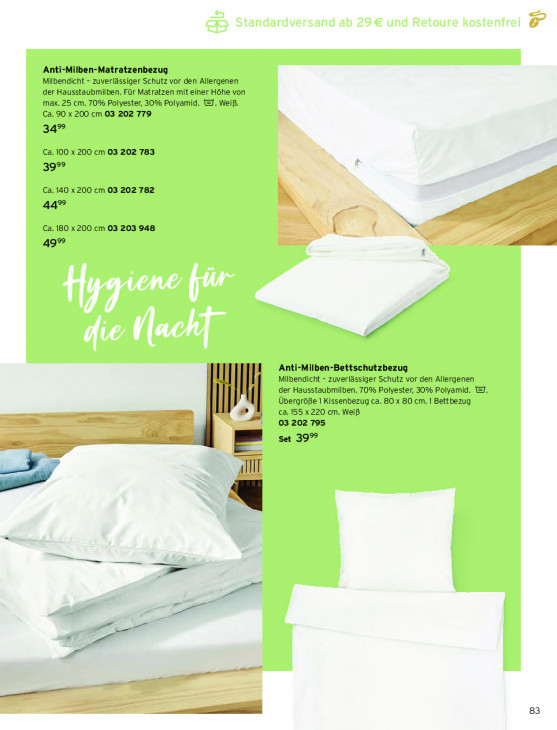 Bitte beachten Sie, dass dieser Text automatisch generiert wird und möglicherweise Fehler enthältAnti-Milben-Matratzenbezug Milbendicht - zuverlässiger Schutz vor den Allergenen der Hausstaubmilben. Für Matratzen mit einer Höhe von max. 25 cm. 70% Polyester, 30% Polyamid. 1. Weiß. Ca. 90 x 200 cm 03 202 779 34% Ca. 100 x 200 cm 03 202 783 399 # Ca. 140 x200 cm 03 202 782 44% À. = Ca. 180 x 200 cm 03 203 948 EX à en A92 Anti-Milben-Bettschutzbezug Milbendicht - zuverlässiger Schutz vor den Allergenen der Hausstaubmilben. 70% Polyester, 30% Polyamid. WJ, Übergröße 1 Kissenbezug ca. 80 x 80 cm. 1 Bettbezug ca. 155 x 220 cm. Wei 03 202 795 Set 39° OT ee Br u Zu 83