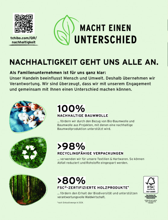 Bitte beachten Sie, dass dieser Text automatisch generiert wird und möglicherweise Fehler enthältof gl MACHT EINEN Els tchibo.com/QR/ nachhaltigkeit UNTERSCHIED NACHHALTIGKEIT GEHT UNS ALLE AN. Als Familienunternehmen ist für uns ganz klar: Unser Handeln beeinflusst Mensch und Umwelt. Deshalb übernehmen wir Verantwortung. Wir sind überzeugt, dass wir mit unserem Engagement und gemeinsam mit Ihnen einen Unterschied machen können. Ee 100% 7 £ NACHHALTIGE BAUMWOLLE … fôrdern wir durch den Bezug von Bio-Baumwolle und Baumwolle aus Projekten, mit denen eine nachhaltige Baumwollproduktion unterstützt wird. 98% RECYCLINGFÄHIGE VERPACKUNGEN .. verwenden wir für unsere Textilien & Hartwaren. So können Abfall reduziert und Rohstoffe eingespart werden. >80% à FSC FSC®-ZERTIFIZIERTE HOLZPRODUKTE* cet …fördern den Erhalt der Biodiversität und unterstützen race naar Dos za er verantwortungsvolle Waldwirtschaft. nem nen “nach Einkaufsmenge in 2024.