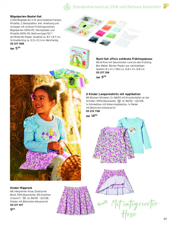 Bitte beachten Sie, dass dieser Text automatisch generiert wird und möglicherweise Fehler enthältSta À ar Bügelperlen-Bastel-Set 22 2.000 Bügelperlen in 8 verschiedenen Farben, Pinzette, 2 Steckplatten. Inkl. Anleitung und Vorlagen mit schönen Frühlingsmotiven. a Bügelperlen 100% PE. Steckplatten und Pinzette 100% PS. Motivvorlage FSC®- <> zertifiziertes Papier. Quadrat ca. 8,7 x 8,7 cm. Schmetterling ca. 12,5 x 9,3 cm. Mehrfarbig 03 217 558 Set 5% Vega Buch-Set »Pixis schönste Frühlingsdose« | Mit 8 Pixis mit Geschichten rund um den Frühling. ÿ Box Metall. Bücher Papier aus nachhaltigen Quellen. B x H x T Box ca. 12,8 x 4 x 12,8 cm KW ® 03 217 516 Set 9% 2 2 Kinder-Langarmshirts mit Applikation Mit Blumen-Stickerei. Gr. 86/92 mit Druckknöpfen an der a Schulter. 100% Baumwolle. {&. Gr. 86/92 - 122/128. 1x himmelblau mit Küken-Applikation, 1x flieder mit Blümchen-Alloverprint 03 213 708 set 1499 ‚ \ / + 5 2 Pe ea à 1 = Kr a Sa = el a 5 x À pe ee dr I CE = a » pa à va a & a Pie 2 ie Bo Ba 3 = FL Re é à ie is D ki rc 3 A a à, Kinder-Ripprock EERS Tr S Mit integrierter Hose. Elastischer wi .# Bund. 95% Baumwolle, 5% Elasthan 23 (Creora®). WI. Gr. 86/92 - 122/128. A Flieder mit Blümchen-Alloverprint & N Y d 03 217 617 & t € & Ü I ges N Í 4 sa 97