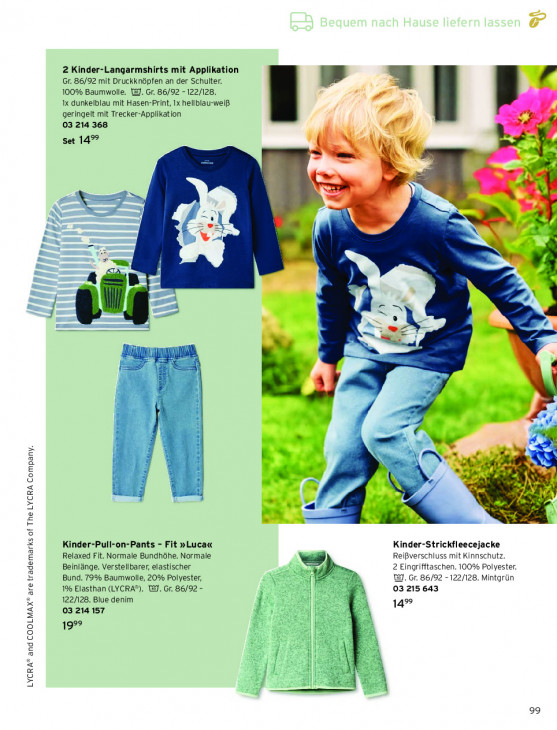Bitte beachten Sie, dass dieser Text automatisch generiert wird und möglicherweise Fehler enthält2 Kinder-Langarmshirts mit Applikation Gr. 86/92 mit Druckknöpfen an der Schulter. PP. + 100% Baumwolle. 1. Gr. 86/92 - 122/128. 1x dunkelblau mit Hasen-Print, 1x hellblau-weiß geringelt mit Trecker-Applikation 03 214 368 «1 ut set 14% A A >, ER K hf ö kh : m nu N = CA Æ % N- ] We N Ee en | | 1% iE | | 1 < î Kinder-Pull-on-Pants - Fit »Luca« Kinder-Strickfleecejacke Relaxed Fit. Normale Bundhöhe. Normale, Reißverschluss mit Kinnschutz. Beinlänge. Verstellbarer, elastischer Ban, 2 Eingrifftaschen. 100% Polyester. Bund. 79% Baumwolle, 20% Polyester, > W. cr. 86/92 - 122/128. Mintgrün 1% Elasthan (LYCRA®). Wd. Gr. 86/92 - 03 215 643 122/128. Blue denim 14% 03 214 157 199 À LYCRA® and COOLMAX® are trademarks of The LYCRA Company. — 99
