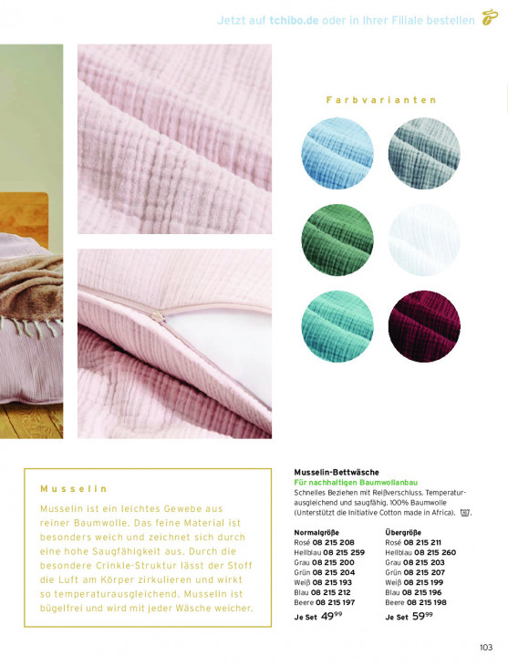 Bitte beachten Sie, dass dieser Text automatisch generiert wird und möglicherweise Fehler enthältfo Pis 4 Farbvarianten À (2; et & Ps E77 3 u # wi F be N n À ks eu 1 / u TE de dk | f #4 RN u À AY \ D \\ | N it N \| \ \ À | | Musselin-Bettwäsche Für nachhaltigen Baumwollanbau Musselin Schnelles Beziehen mit Reißverschluss. Temperatur- Musselin ist ein leichtes Gewebe aus ausgleichend und saugfähig. 100% Baumwolle (Unterstützt die Initiative Cotton made in Africa). @. reiner Baumwolle. Das feine Material ist Normalgröpe Übergröße besonders weich und zeichnet sich durch Rose 08 215 208 Rose 08 215 211 Hellblau 08 215 259 Hellblau 08 215 260 eine hohe Saugfähigkeit aus. Durch die besondere Crinkle-Struktur lässt der Stoff Grau 08 215 200 Grau 08 215 203 Grün 08 215 204 Grün 08 215 207 die Luft am Körper zirkulieren und wirkt Weiß 08 215 193 Weiß 08 215 199 Blau 08 215 212 Blau 08 215 196 so temperaturausgleichend. Musselin ist Beere 08 215 197 Beere 08 215 198 bügelfrei und wird mit jeder Wäsche weicher. Jeset 49°° Je Set 59% 103