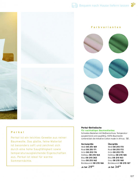 Bitte beachten Sie, dass dieser Text automatisch generiert wird und möglicherweise Fehler enthältFarbvarianten 000 es Perkal-Bettwäsche Für nachhaltigen Baumwollanbau Perkal Schnelles Beziehen mit Reißverschluss. Temperatur- ausgleichend und saugfähig. 100% Baumwolle Perkal ist ein leichtes Gewebe aus reiner (Unterstützt die Initiative Cotton made in Africa). td. Baumwolle. Das glatte, feine Material Normalgröpie Übergröße ist besonders soft und zeichnet sich Weiß 08 215 169 Weiß 08 215 170 durch eine hohe Saugfähigkeit sowie Rose 08 215 171 Rosé 08 215 172 Grün 08 215 174 Grün 08 215 175 temperaturausgleichende Eigenschaften Hellblau O8 215 164 Hellblau O8 215 165 aus. Perkal ist ideal für warme Blau 08 215 363 Blau 08 215 163 Sommernächte. Grau 08 215162 Grau 08 215 168 Bordeauxrot 08 215 166 Bordeauxrot 08 215 167 Je set 29°° Je set 34°° 107