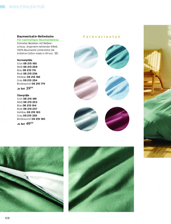 Bitte beachten Sie, dass dieser Text automatisch generiert wird und möglicherweise Fehler enthältBaumwollsatin-Bettwäsche Schnelles Beziehen mit Reißver- schluss. Angenehm kühlender Effekt. 100% Baumwolle (Unterstützt die Initiative Cotton made in Africa). 1. Normalgröpe Grün 08 215 185 A Weiß 08 215 258 N Blau 08 215 176 Rosé 08 215 256 Hellblau 08 215 182 Grau 08 215 254 Bordeauxrot 08 215 179 Je set 399° Übergröße Grün 08 215 189 z Weiß 08 215 253 Blau 08 215184 Rosé 08 215 257 Hellblau 08 215 183 Grau 08 215 255 Bordeauxrot 08 215 180 Je Set 49°° = 2 mj XIE f A ij Ge ire RE 5 ie Je LE / 2 id 4 gk zl 13 jk zis 5 F7 al a B iz EA, 2 Rn ns à w ARE x ik x à 108