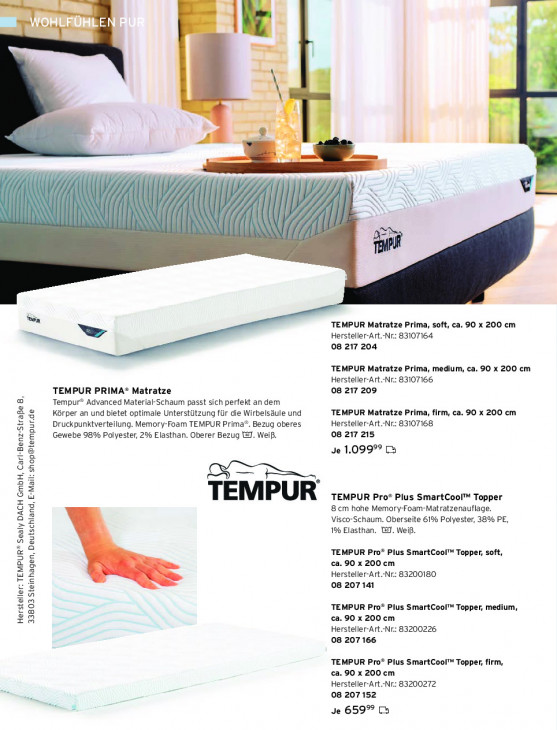 Bitte beachten Sie, dass dieser Text automatisch generiert wird und möglicherweise Fehler enthältpa Le = Lo) IE her, À ro (5 Ee Ps Jl Ni N hed TEMPUR Matratze Prima, soft, ca. 90 x 200 cm Hersteller-Art.-Nr: 83107164 08 217 204 TEMPUR Matratze Prima, medium, ca. 90 x 200 cm Hersteller-Art.-Nr: 83107166 TEMPUR PRIMA® Matratze 08 217 209 Tempur” Advanced Material-Schaum passt sich perfekt an dem Körper an und bietet optimale Unterstützung für die Wirbelsäule und TEMPUR Matratze Prima, firm, ca. 90 x 200 cm Druckpunktverteilung. Memory-Foam TEMPUR Prima®. Bezug oberes Hersteller-Art.-Nr: 83107168 08 217 215 Gewebe 98% Polyester, 2% Elasthan. Oberer Bezug TA. WeïB. Je 1.099 C3 [email protected] TEMPUR TEMPUR Pro® Plus SmartCool" Topper 8 cm hohe Memory-Foam-Matratzenauflage. Visco-Schaum. Oberseite 61% Polyester, 38% PE, 1% Elasthan. WI. Weiß. TEMPUR Pro® Plus SmartCool"“ Topper, soft, ca. 90 x 200 cm Hersteller-Art.-Nr: 83200180 08 207 141 TEMPUR Pro® Plus SmartCool* Topper, medium, Hersteller: TEMPUR® Sealy DACH GmbH, Carl-Benz-Straße 8, 33803 Steinhagen, Deutschland, E-Mai ca. 90 x 200 cm Hersteller-Art.-Nr: 83200226 08 207 166 TEMPUR Pro® Plus SmartCool"“ Topper, firm, ca. 90 x 200 cm Hersteller-Art.-Nr: 83200272 08 207152 Je 659 ©